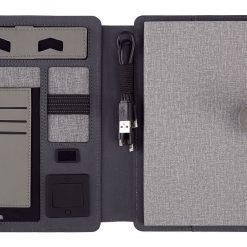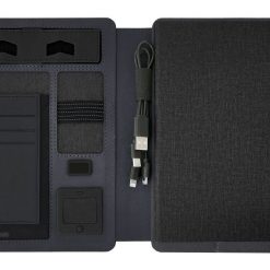 – Sổ sạc đa năng SD1001 có kích cỡ giấy A5. Bìa được làm từ da PU với thiết kế lịch lãm, tinh tế, sang trọng. Bìa trước có các khe để cài tài liệu và namecard.